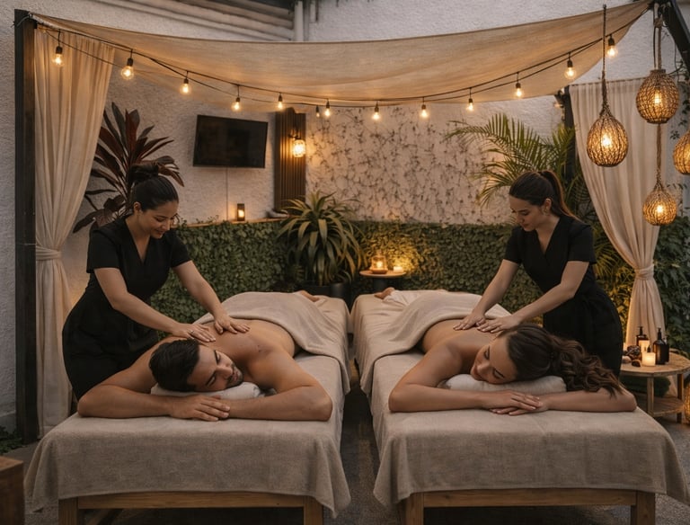 Una experiencia compartida de relajación y conexión, donde ambos disfrutan simultáneamente de un masaje en un ambiente armonioso que invita al descanso, la calma y el bienestar en compañía.